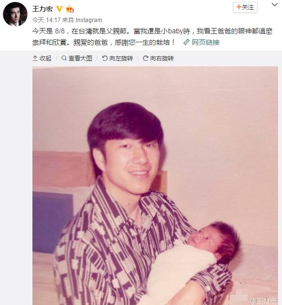 腾讯娱乐讯 8月8日,王力宏晒出自己baby时期和爸爸的合影,附文称:“今天是 8/8,在台湾就是父亲节。当我还是小baby时,我看王爸爸的眼神都这么崇拜和欣赏。亲爱的爸爸,感谢您一生的栽培!”
