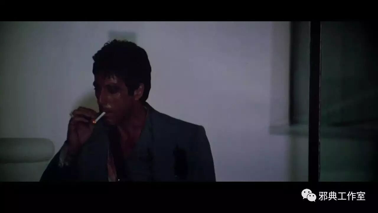 这是我最喜欢的一个镜头,托尼杀掉黑老大当晚,去了情人的家里,让女人赶紧收拾,跟他走。这时候的他一身疲惫,受了伤,浑身带血。在寂静的深夜里,叼了一根烟,却显得那么孤独、沧桑。是啊,他赢得了这个世界。