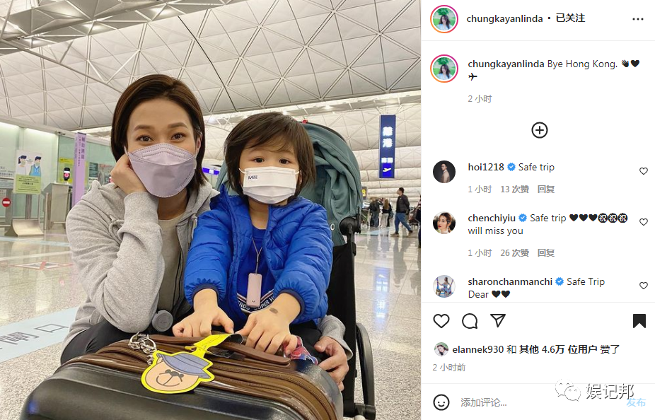 当晚(1月19日晚),钟嘉欣携子在香港机场留念,并晒出照片和影迷分享。