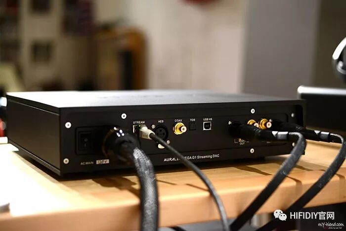 VEAG G1的背面,介面相当齐全,类比输出有平衡XLR、RCA各一组,数位输入有USB HS、TOS、COAX、AES与STREAM。