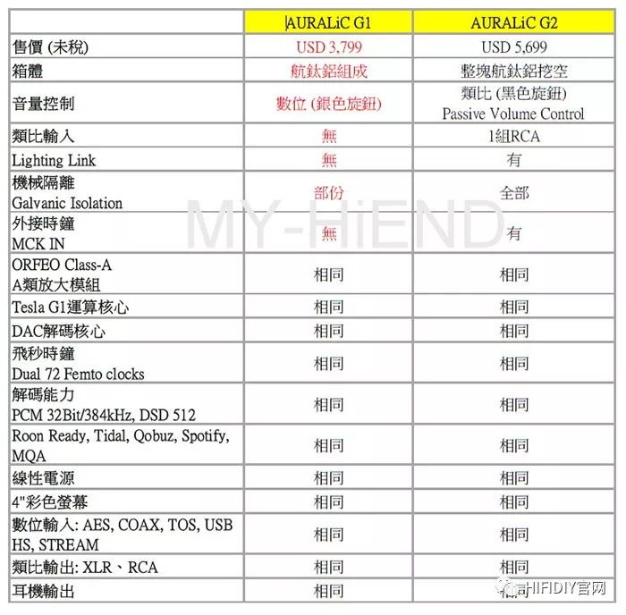 VEGA G1与VEGA G2有什麽不同,除了价格之外还有什麽差别?两者外观几乎一样,除了VEGA G1的音量选钮改为银色之外,乍看之下还真看不出有什麽差别,魔鬼就隐藏在细节当中,我简单做了一个比较表,将其主要差别列出来,当然这并非官方的资料,若有错误的地方欢迎随时指正,从比较表看出,两者主要的差别在於VEGA G2为全铝挖空的机壳,有类比输入、Lighting Link,机械隔离、时钟输入,其他则都相同,两台的价差USD 2,000,就看预算来选择了。