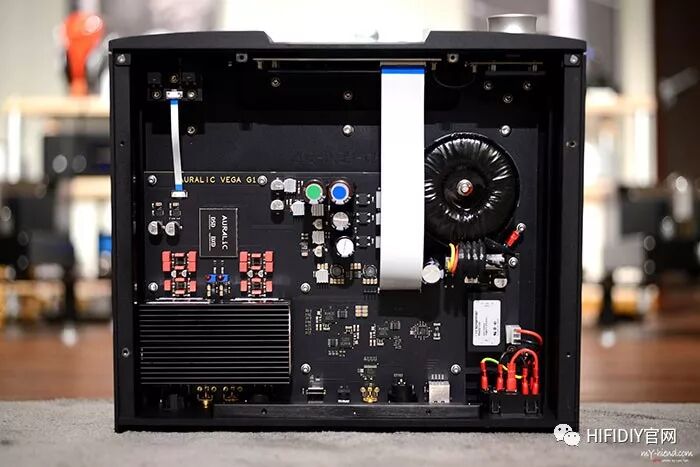 VEGA G1的内部,AURALiC的产品线路设计与制作一向是业界的模范生,配置简洁整齐,高水准的工艺,让人无可挑剔,我也特地拍了许多内部的特写,大家可点击放大仔细观看。VEGA G1采用线性电源供电,使用一颗大型的加拿大plitron环型变压器,左上方为独立的耳机放大模组,运算中心为自家强大的Tesla G1(Quad-Core Cortex-A9处理器1GHz、1GB DDR3 RAM、4GB储存),一颗Asahi Kasei AK4113、三颗XMOS 8U6C5及一颗Microchip KSZ9031RNX接收晶片,各自对应不同的数位输入,类比放大为自家ORFEO Class-A A类放大模组(左右声道各一颗位於左下方的散热片下)。