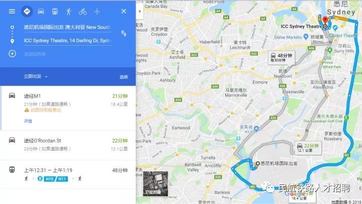 因为没钱没去澳洲,更没去张靓颖演唱会,所以假设张靓颖能够在悉尼时间晚上11点准时结束演唱会,不参加庆功宴、也不参加媒体采访、甚至不卸妆不换衣服直接从icc theater出发到悉尼国际机场,这段路大约要花多久呢?20分钟。