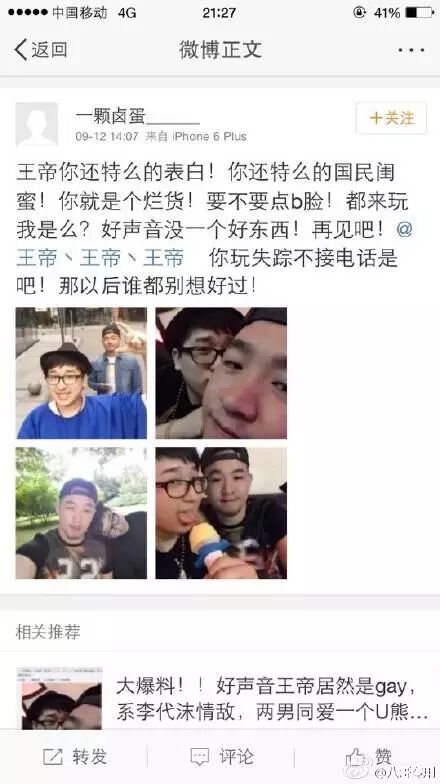 本季好声音不温不火地进行着,估计庾澄庆组的王帝是这季最能让人记住的选手了。三年前,李代沫大火时,男友“一颗卤蛋”爆出他与李代沫的床照,并说李代沫火了以后就踹了他。如今他又爆出自己与王帝的基情.……