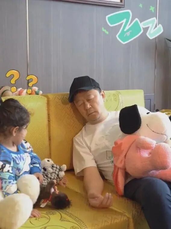 郭涛坐在沙发上怀抱着玩偶,慈爱的摸着小女孩的头,拿着手里的玩具逗孩子玩,画面非常温馨。但是画风一转,他已经躺在沙发上打呼噜,睡得十分香甜,独留小女孩在一旁满脑袋问号,生动的演绎了爸爸带孩子的结果。