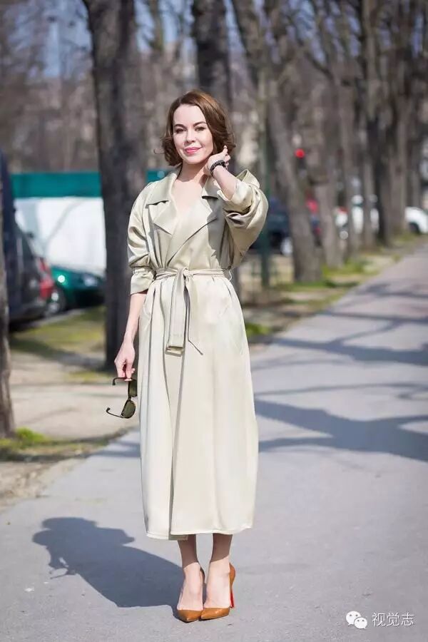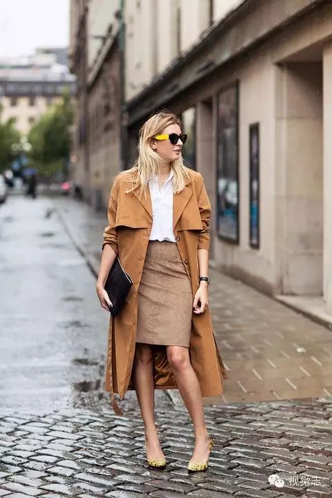 如果你不喜欢穿长裤,那就在风衣内穿一条大方得体的连身裙或是高腰裙。同样是经典look,方便又快捷。