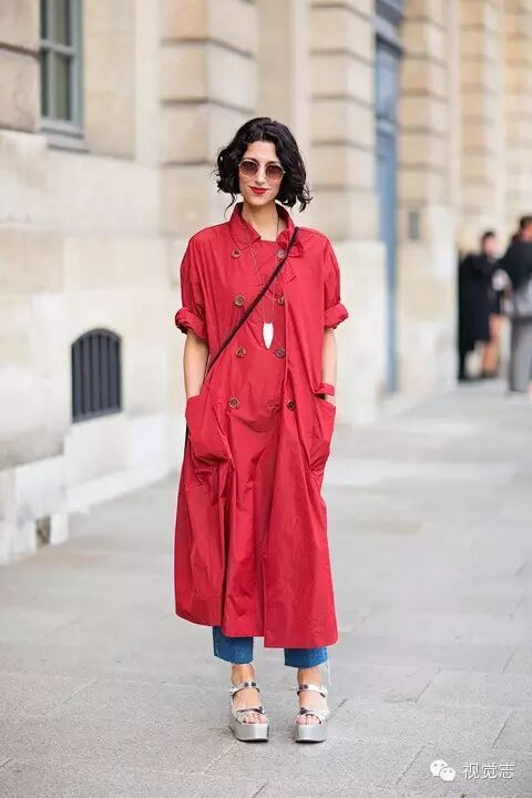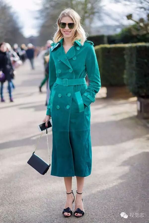 卡其色固然经典,但如果想出其不意的话。那么饱和度偏高的彩色风衣就是你的正选了!孔雀绿、玫粉色或者浓浓的正红色,这些非常小众的颜色如果穿好了整体气场真的上升一个Level。