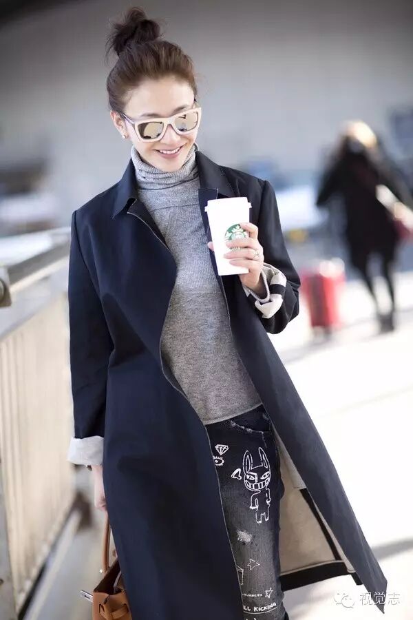 李小冉也扎着丸子头出发,一身深色风衣配印花牛仔裤超有街头范儿。