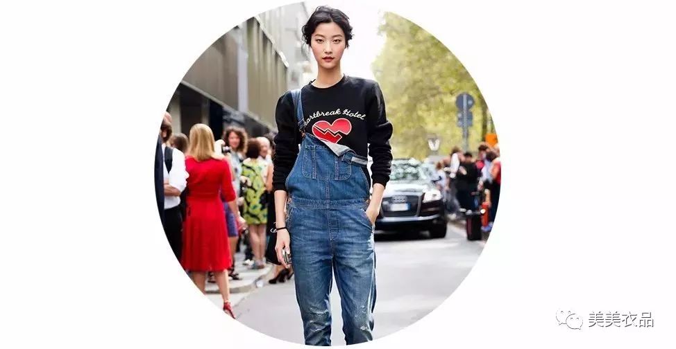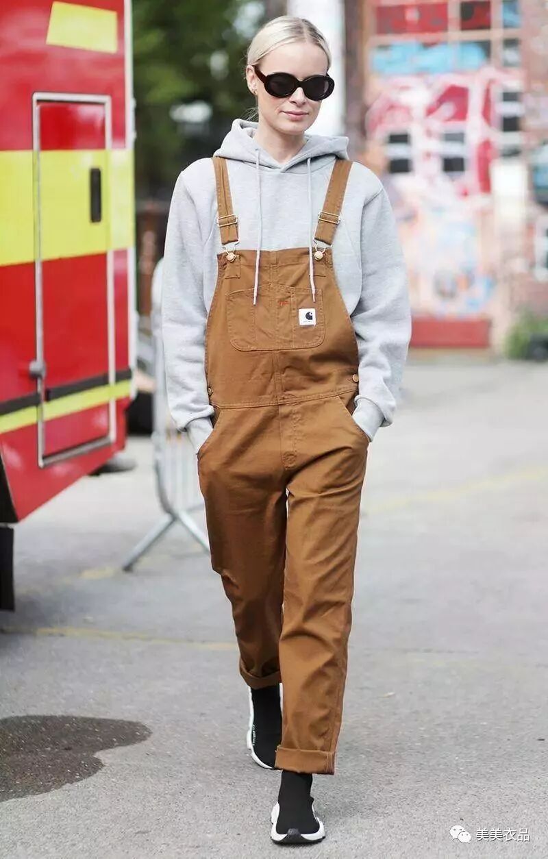 同样的背带裤搭配卫衣,改变一下背带裤的穿法又是不一样的时髦,单肩背带裤显得有些“衣衫不整”,但却是露出内搭的好办法,穿出个性街头感。