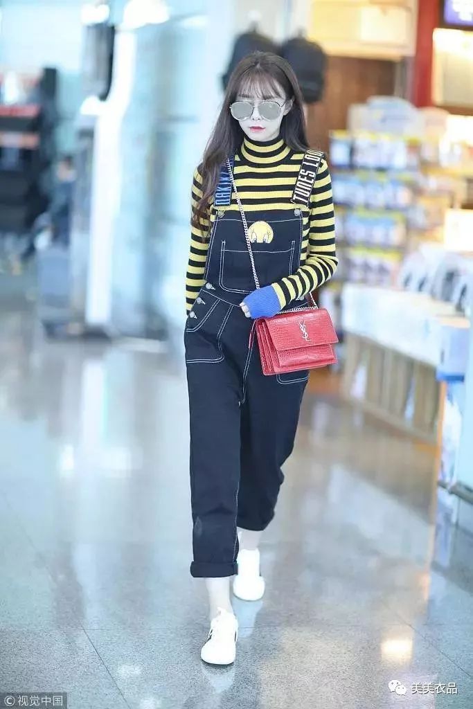 亮色系的条纹针织衫更显白,搭配带着卡通图案的背带裤,可爱减龄,加上一双小白鞋,有点复古学院风,感觉就像学生党了。