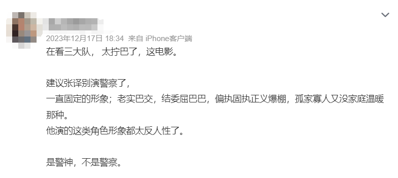 张译,这一年都演了啥 Sir电影 内地男星 2024-01-06 00:36:45 318 创作不易,用心坚持,欢迎请BaGua喝几杯爱心咖啡!打赏并支持本文 打赏并删除本文 2023年,可能是张译困惑的一年。好消息:大丰收。年初一部大爆的《狂飙》,年末一部豆瓣7.8的《三大队》,票房已过6亿。这中间还有电影《满江红》《刀尖》《无价之宝》,电视剧《欢颜》《他是谁》。坏消息:无效播出。虽然作品不乏口碑,也不乏热度,但好像对张译没什么加成。反而让他一向不错的风评,发生了微妙的变化。《狂飙》里最出圈的是张颂文。张译饰演的安欣,不能说演技不好,但这个正面角色反而观众缘最差。到了现在的《三大队》,片子是不错,可是有些观众却不耐烦了——张译怎么现在演什么都一个样?对比一看,好像从造型到人设都很相似——忠诚、奉献、苦情。△ 《狂飙》里的安欣,《他是谁》里的卫国平,与《三大队》里的程兵从无冕影帝封神到“演啥都一个样”。Sir并不是要跟风黑。而是想聊聊,像张译这样优秀的演员,是否正在遇到瓶颈。01警察专业户2023年的张译,似乎一直在重复。白头,白头,再白头。算上2022年国庆档的《万里归途》。张译就在不停地“执行任务”。小人物,忍辱负重,热血难凉……一看到张译的脸,你就知道,他又要来感动你了。这些角色通常有两面。一是无奈。面对大人物的小人物,微微驼背,整个人往内缩,点头作揖,眼皮子耷拉,嘴皮半笑不笑,带着讨好和无措。二是执着。刑侦查案,眉头紧皱,嘴唇抿起,神色严肃,眼皮压低,眼里若有所思。事实上,这类一股脑执行任务,投入到高尚事业中的角色,张译之前也演过,而且也赚了不少眼泪。比如《红海行动》《我和我的祖国》。只是去年,这样的“感动”来得过于密集了。似乎换一套衣服,就能到另一剧组里无缝出演。张译演技退步了吗?他的演绎贴近角色。只是他的角色在重复。“警察/公安/正派专业户”成了张译的标签。这种社会角色的重复,成了观众的第一重审美疲劳,“张译别再演警察了”。张译的警察人设,也在重复,造成了观众的第二重审美疲劳。《狂飙》里的警察类型,起码四类。师傅曹闯,一方面关照后生,另一方面会为了仕途当“内鬼”,正邪交杂。李响,看起来温吞、老好人,似乎时刻在“黑化”的边缘徘徊,最后才发现是在隐忍负重。杨健,前半生豪气干云,后半生与黑社会勾结,甚至显得唯唯诺诺,偷偷变坏,为生活折腰。安欣,从一而终,热血赤诚,说刚就刚,为了心底的正义,爱人、师傅、战友都可以不顾,头发白了,依然一根筋“轴”到底。但张译,好像就专演一种警察。《三大队》里的程兵,乍看是个跟安欣不太一样的角色。他比安欣更强势、更硬气、更有话语权。“动!”声音加重,言简意赅,说一不二。这是刚出场的程兵。但随着入狱、出狱、追查无果、战友一个个离开,程兵又成了安欣——头发花白,依然死磕;亲友劝言,不屑一顾;孤勇追凶,真相大白。从京海市唯一纯白的茉莉花变成刑警片里唯一纯白的茉莉花。在角色身份与设定的双重重复下,张译逃离不开安欣。特别是在国产刑侦片愈发类型化的当下,“安欣式”人物几乎成为必备品。问题是,安欣为什么老是张译?02“苦”系演员从很早以前,张译的角色就是安欣式的。甚至可以说,张译就是安欣本人。抛开警察的社会身份,安欣的人物特点是什么?“苦”跟“轴”,越苦越轴,越轴越苦。张译亦如此。“孩子你今年能不能别考表演系了?你明年再来,试一试导演系,文学系也行。”1997年,迷上演员这一职业的张译,从东北跑到北京考学,接连遭到军艺的落选、中戏的“婉拒”。不断碰壁,不停面试。半年多后,张译接到了北京军区战友文工团的通知,以自费生的身份进入文工团。但离演员梦依然很遥远。“你演戏就是个死啊!”张译的恩师“五大爷”在退伍前,跟张译苦口婆心劝他别演戏了。那时候的张译,是团里最不起眼的存在,跑龙套、当B角,演技不被认可。有一次,因为外聘的女导演点名要张译演男三号,结果整个剧组解散了。领导说,团里看上的演员,女导演一个都没用,偏偏挑了几个最不会演戏的。当时剧组在团里只选了张译,他明白领导这是在“点”自己。对于一心想成为演员的张译来说,周围人的否定让他感到苦涩。△ 表演话剧时的张译但是,越是处境苦涩,越能显出张译的“轴”。“剧组,我也跑过,而且一跑,就是五年。”在一场颁奖典礼,张译讲起无人问津时期的经历。五年间,他跑了几百个剧组,照片和简历发了上千份。“那时候,维系我作为演员身份的唯一标志,不是演戏,而恰恰就是跑剧组。”2005年,电视剧《士兵突击》开始选角。这一部戏,算得上张译的转折点。四年前,《士兵突击》还是一场名为《爱尔纳·突击》的话剧。张译在里头忙里忙外,当场记、画外音、群演、监狱警察扮演者、袁朗B角。△ 话剧《爱尔纳·突击》里的张译,只有一句台词:“你的时间到了。”就是没有一个能过足戏瘾的正儿八经的角色。张译只能在散场结束后,在漆黑的剧场里守着空荡荡的观众席,把整场戏从头到尾演一遍。没有灯光,没有观众,没有喝彩,只有自己与秉持的信念感。演员界的“安欣”,或许在这一刻可以定调。所以当《士兵突击》拍成电视剧的消息传来,张译的轴劲儿上来了。他给导演写了一封3000字的自荐信,里面列举了自己适合剧中主角“许三多”的16