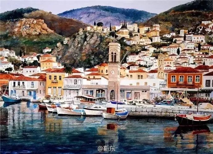 微博配图来自希腊艺术家Pantelis Zografos的水彩画,展现的是爱琴海的风情万种。