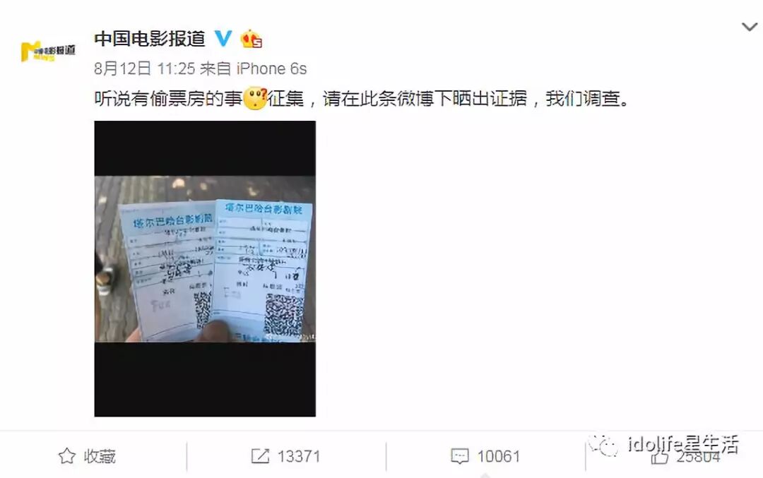 中国电影报道昨天发了条微博,质疑某电影偷票房,请网友提供证据 ↓