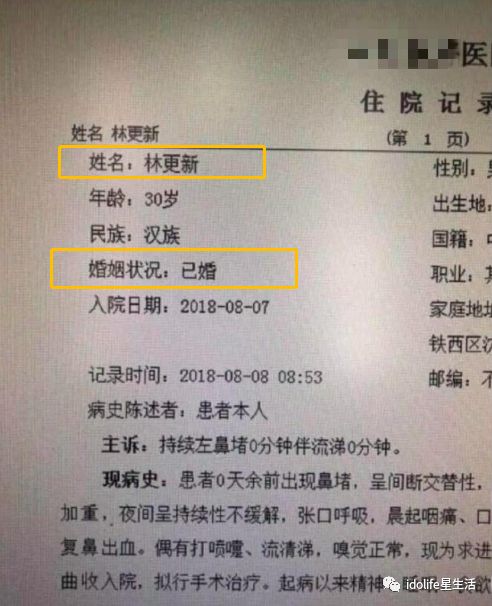 林更新被爆出已婚,是因为网友偶遇他去动个小手术,而病历上婚姻状况那栏赫然写着“已婚”两个大字 ↓