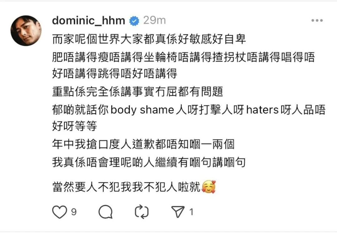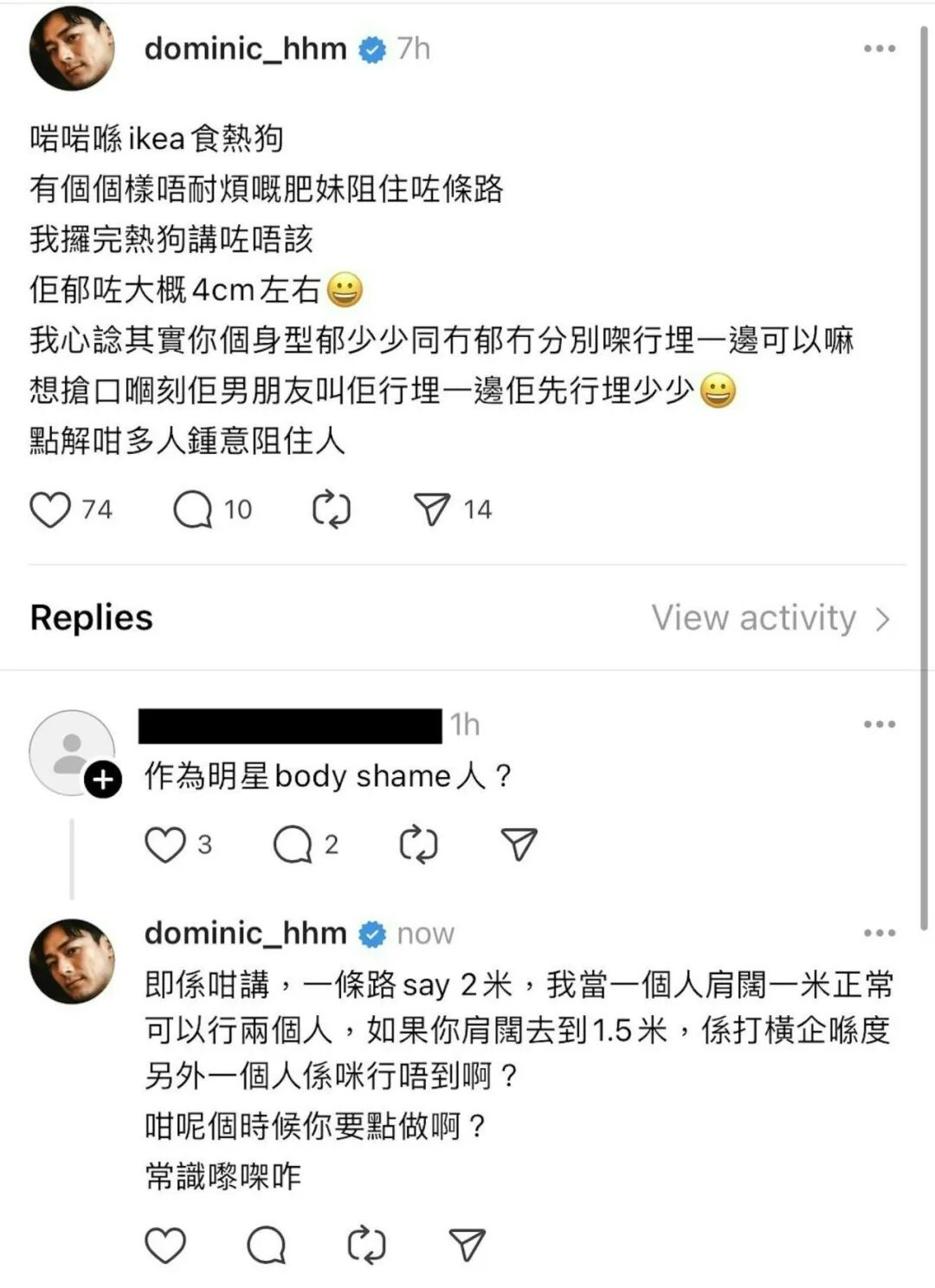 何浩文分享遭「肥婆」阻路又唔肯讓的經歷,有網民就認為他不應「Body shame」,但他否認。(Threads@dominic_hhm)