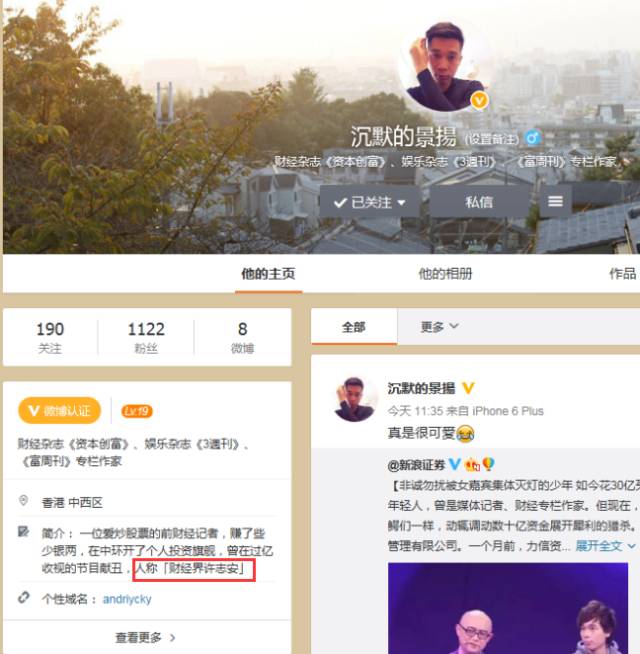 在陈景扬的社交平台上,他这样表述自己:“一位爱炒股票的前财经记者,赚了些少银两,在中环开了个人投资旗舰,曾在过亿收视的节目献丑,人称财经界许志安。”