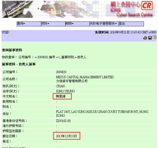 陈景扬目前在两家公司中担任董事或股东。成立最早的是一家名叫“火木集团国际有限公司”的公司,成立于2012年8月15日。力信资本管理公司则成立于2013年12月10日。对于力信资本管理有限公司的成立时间,一些媒体误报为2012年。2012年,应为陈景扬开始设立火木集团国际有限公司的时间。而且公开信息还显示,火木集团国际有限公司曾名为利扑传动有限公司。