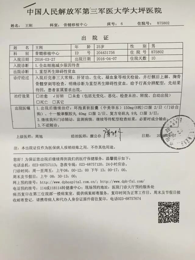 他叫王刚,1991年生,甘肃天水市武山县人,原赛玛特员工。2016年3月27日,王刚在大坪医院被确诊为“重型再生障碍贫血”,血小板值为1,连正常人值零头都不足,俗称白血病, 需要进行骨髓移植手术。对一个农村普通家庭来说,这无疑是个天大的噩耗。