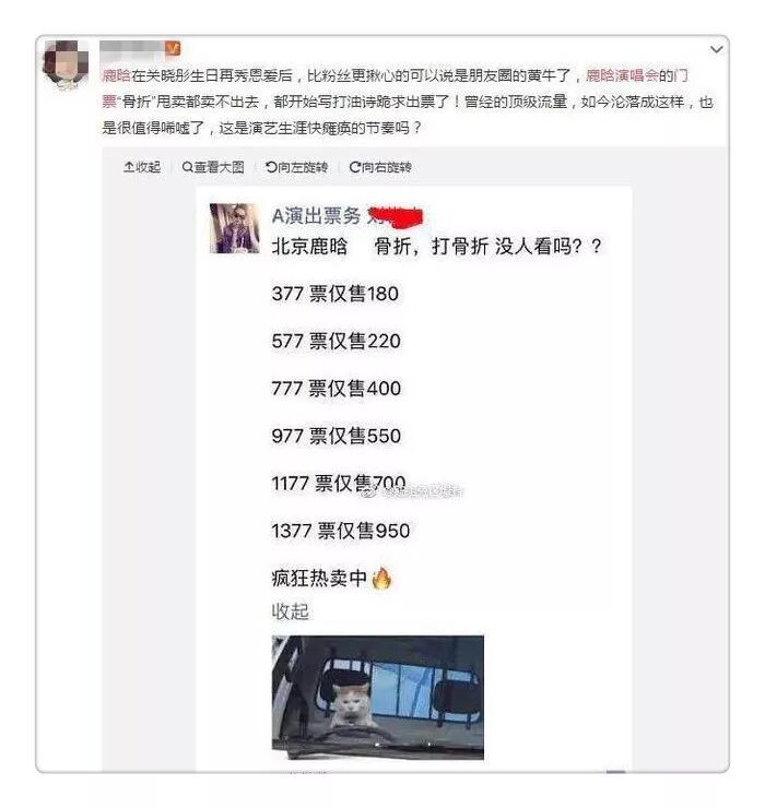 想想当初鹿晗处在人气巅峰的时候,只要开演唱会就没有不爆满的,即使人气有些水分,但也不会多,而黄牛党也正是看到了其中的商机,在鹿晗二巡的时候也是早早囤了很多票,可现在却让人大跌眼镜,赚不到钱不说,甚至打1折都难卖出去,黄牛党们都哭了,也有网友感叹:当初的顶级小鲜肉要开始凉了吗?
