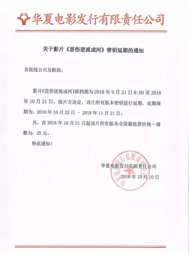而10月11日,电影官方宣布,该片密钥延期至11月21日。并将全国最低统一票价定为25元。