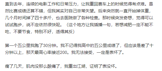 去年因为连续的电影工作和日常压力,让我重回赛车上的适应觉得有点难。虽然比赛成绩还算不错,但我其实对自己非常失望。突然就一直开始掉体重,几个月时间掉了四十多斤,去医院做了各种检查。