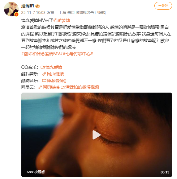 潘玮柏蒋梦婕合拍MV,新歌狠戳失恋痛点!网友:很有意境,无法自拔 钱江晚报 港台男星 2025-11-07 14:00:15 5 创作不易,用心坚持,欢迎请BaGua喝几杯爱心咖啡!打赏并支持本文 打赏并删除本文 11月6日晚,潘玮柏在社交平台发文晒图:悼念愛情11月7日早10:00am,边吃面条边看MV成品,有些细节一定要仔细看!明天讨论!11月7日早上,潘玮柏发布悼念爱情MV并@蒋梦婕:写这首歌的时候,其实是把爱情当作即将离开的人。感情的消逝是一种从灿烂到黑白的过程,所以想到了用消除记忆来悼念。其实拍这个记忆消除的故事,我身边每个人在看到故事脚本和成片之后的感觉都不一样,你们看到的又是什么样的故事呢?欢迎一起讨论,让我听听你们的想法~随后,蒋梦婕在下放评论:终于等到mv上线啦~这个故事在我看来更像是在怀念回不来的爱人,相处的时光有多甜蜜,逝去的记忆就有多酸涩!还是很开心能够参与老哥这支mv,这个故事有很大跨度的情绪,有开心也有遗憾,演起来真的很爽! 网友评论:潘玮柏,1980年8月6日出生,华语流行乐男歌手、影视演员、节目主持人,毕业于美国加州州立理工大学大众传播系。潮新闻·钱江晚报记者 刘睿阳综合自@潘玮柏、网友评论等责任编辑:何昉堃 创作不易,用心坚持,欢迎请BaGua喝几杯爱心咖啡!打赏并支持本文 打赏并删除本文 感谢您的支持鼓励,我会继续努力的!文章地址:用户邮箱:打赏金额:USDT 请输入数字点击”去打赏“,即可进行打赏支持本文章哦 潘玮柏 发表评论