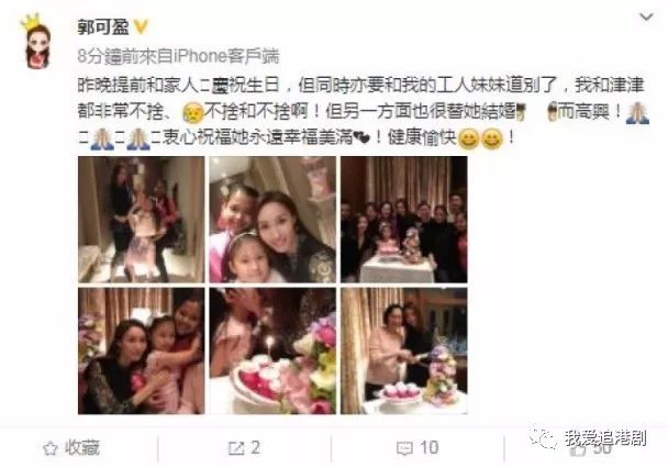 郭可盈在微博上载多张相,她留言:“昨晚提前和家人庆祝生日,但同时亦要和我的工人妹妹道别了,我和津津都非常不舍、不舍和不舍啊!但另一方面也很替她结婚而高兴!衷心祝福她永远幸福美满?!健康愉快!”