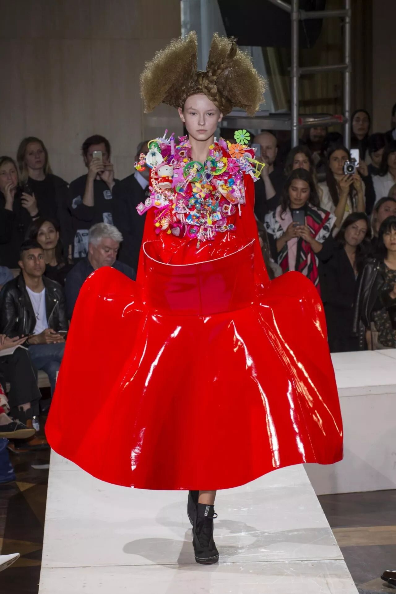 除此之外,编辫子等带有幼稚气息的发型也是对女权主义新的诠释。Kathleen Hanna 在《Riot Grrrl Manifesto》(暴女运动宣言)中写道:“我们对这个告诉我们女孩就是愚蠢、糟糕、软弱的社会感到愤怒。” 转眼之间 Sanrio 就将朋克纳入在内,和 T.U.K. 合作超厚底皮鞋,Kitty 头上的蝴蝶结也有了格纹呢版本。Reiko Yano 指出,Sanrio 的周边产品没有界限,甚至包括了 Stratocaster Fender 吉他。当然这并不是说每次拿出一把 Sanrio 吉他就很酷很有颠覆性:参考 Avril Lavigne 2014年凶残的单曲《Hello Kitty》。