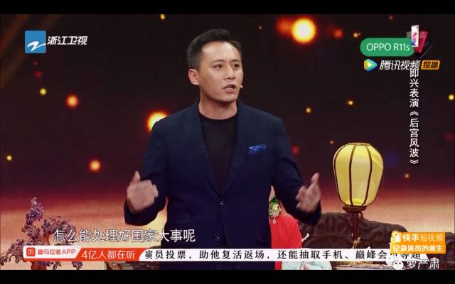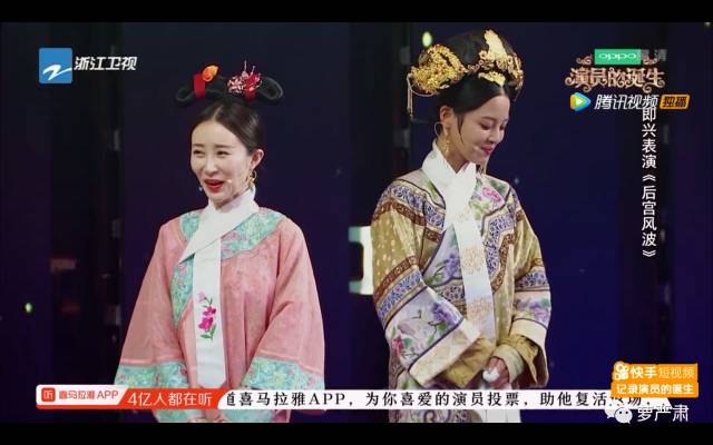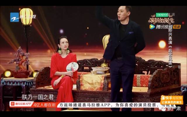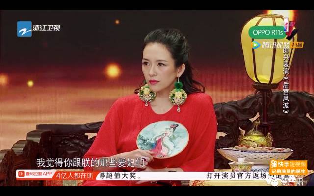说是即兴无台本,但章子怡跟刘烨基本上是在两个次元,章子怡是努着劲儿想演个宫廷感,眼神、身段、扇扇子的动作都在认真进入状态。