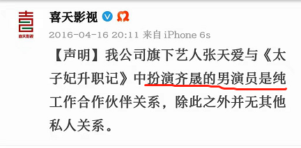 谁知道没多久,张天爱这边就主动拆CP,公司发的声明里,除了跟盛一伦极力撇清关系,甚至连盛一伦的名字都懒得写,直接来一句“《太子妃升职记》中扮演齐晟的男演员”,嘴脸也很难看了。