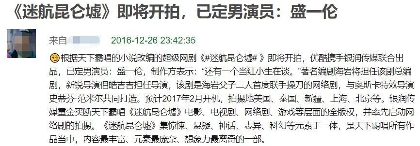 《太子妃升职记》走红,网上还爆出天下霸唱的小说即将改编成网剧《迷航昆仑墟》,导演同样是侣皓吉吉,而盛一伦属于已经敲定的男演员。