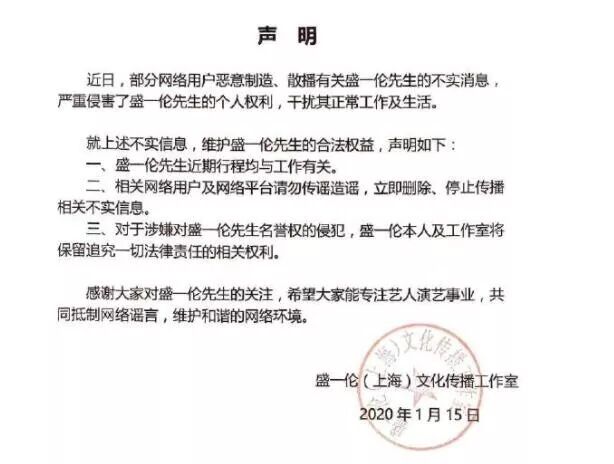 “近日网络上有关盛一伦先生私生活的传言均为不实消息”。