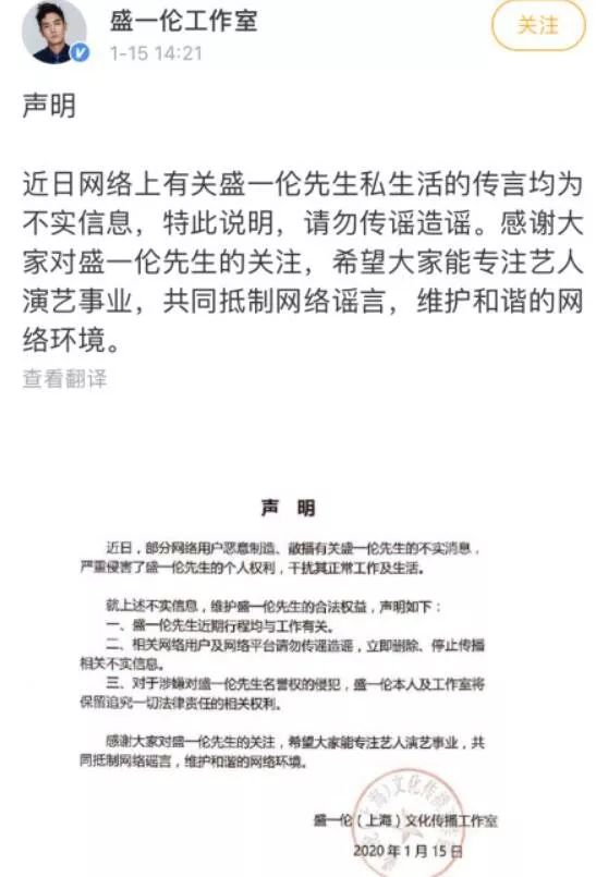 很快,盛一伦工作室发布了声明,进行辟谣和澄清: