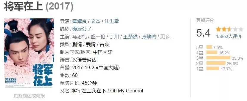 和金马影后马思纯主演的《将军在上》,口碑也不高。