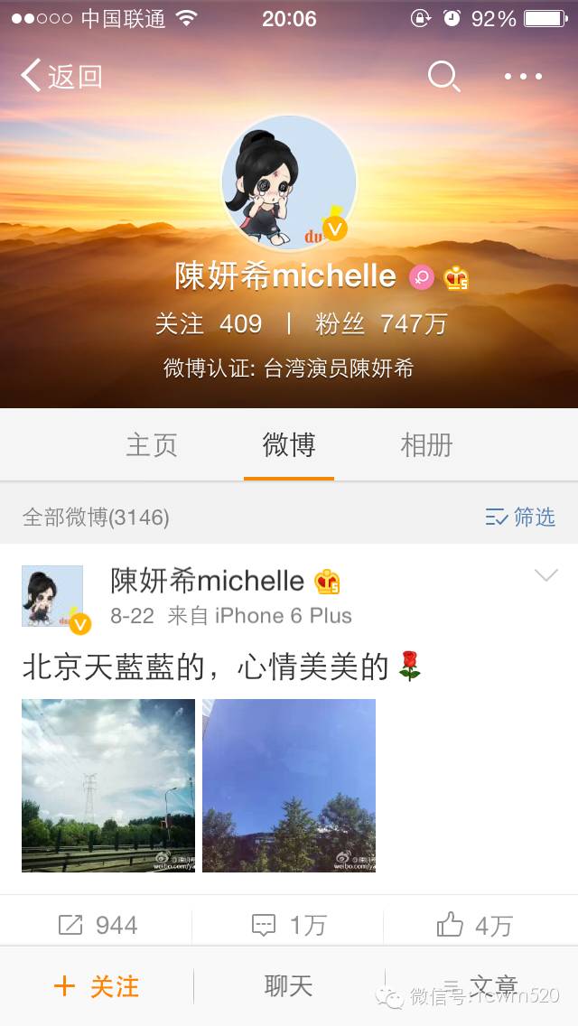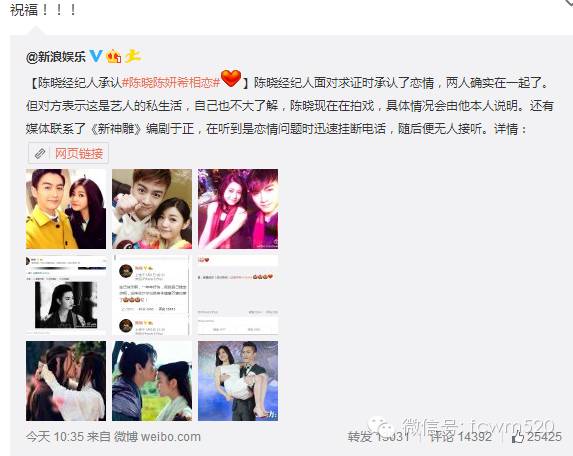 今天早上,风行工作室曝光了一组陈晓和陈妍希的照片,这对因戏相识的两人由荧幕情侣变成现实,随后双方的经纪公司都纷纷证实其恋情,并大方送上祝福。查看双方的微博动态,陈晓微博更新至昨天,一张全身的照片搭配一只可爱的兔子表情。陈妍希的微博虽然更新到8月22日,虽然两人都没对此事作出回应,但是陈妍希的内容嘛:“北京蓝蓝的,心情美美的。”哈哈,谈恋爱了可不是就有个美好的心情呢!恭喜恭喜啊!
