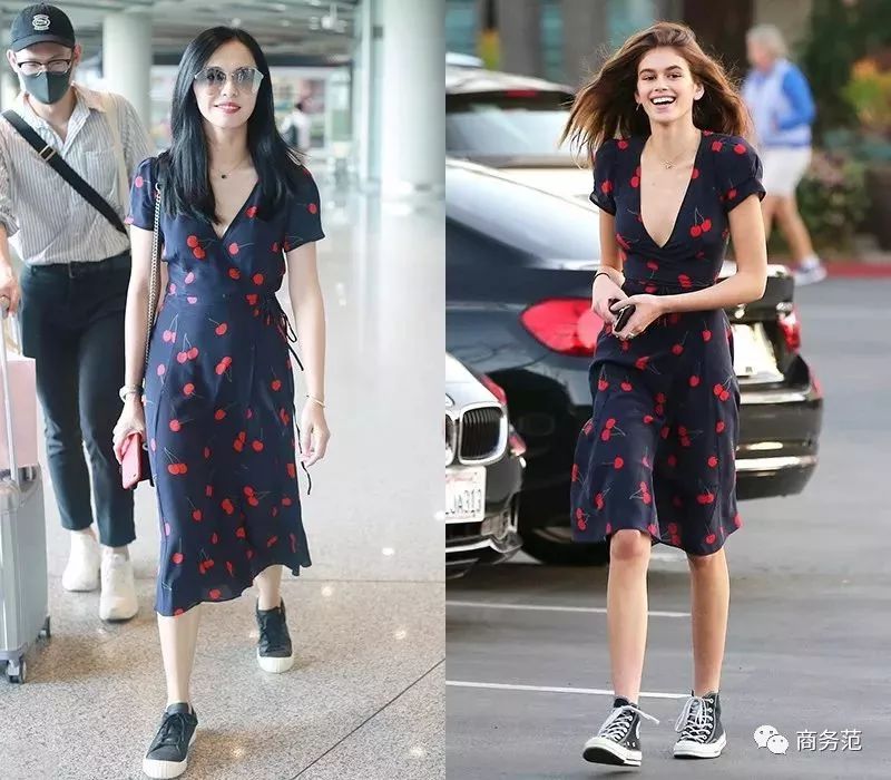 比如姚晨这件Realisation Par樱桃印花半袖裙,喜欢它的款式却没有像Kaia Gerber那样大胆穿出街的勇气,把领口提高一点,看上去和普通的围裹式夏日茶歇裙无异,穿出街依然很自信。
