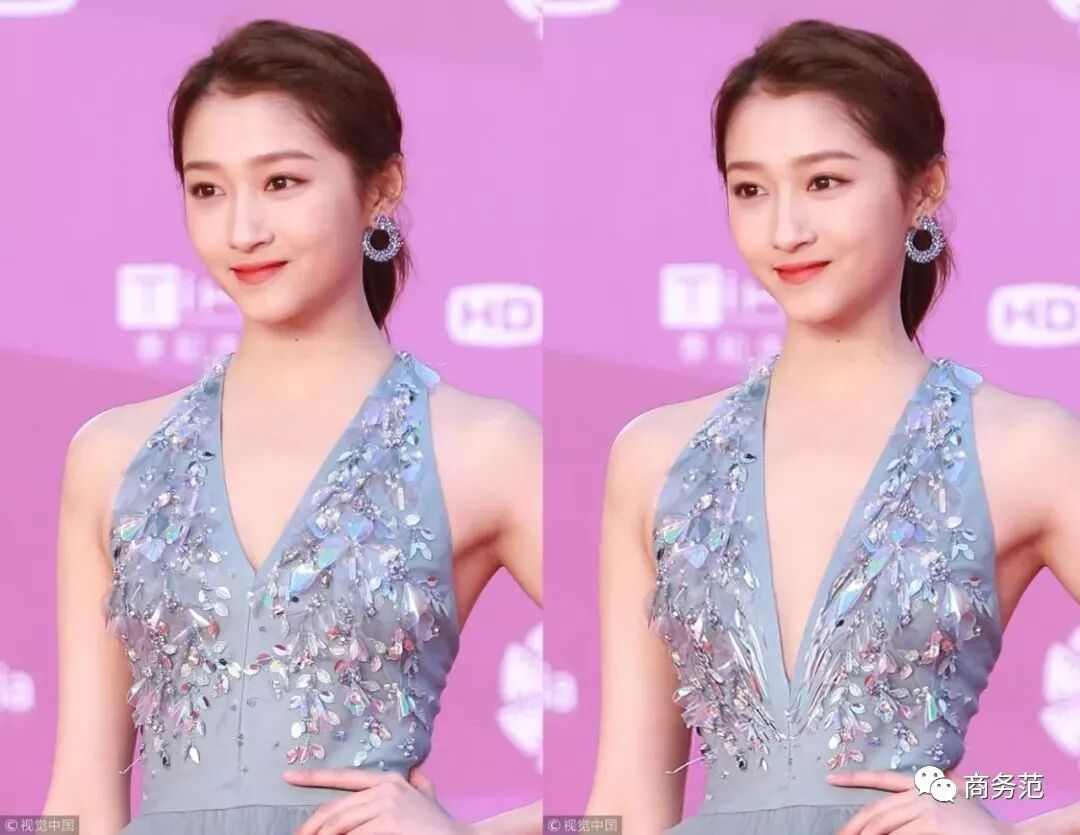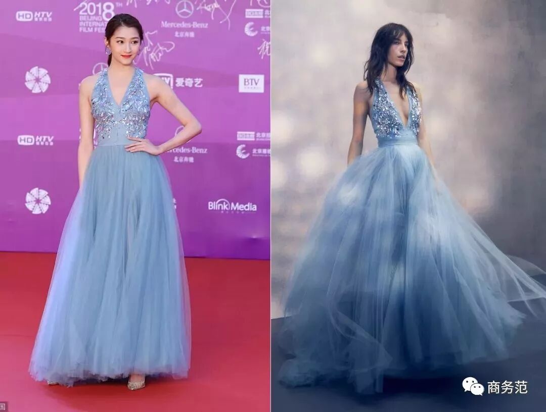 同理还有关晓彤,这件Jenny Packham 2018春夏款蓝色长裙本是一件仙裙,就是因为缝合的太多,更像是完全变了一件礼服。
