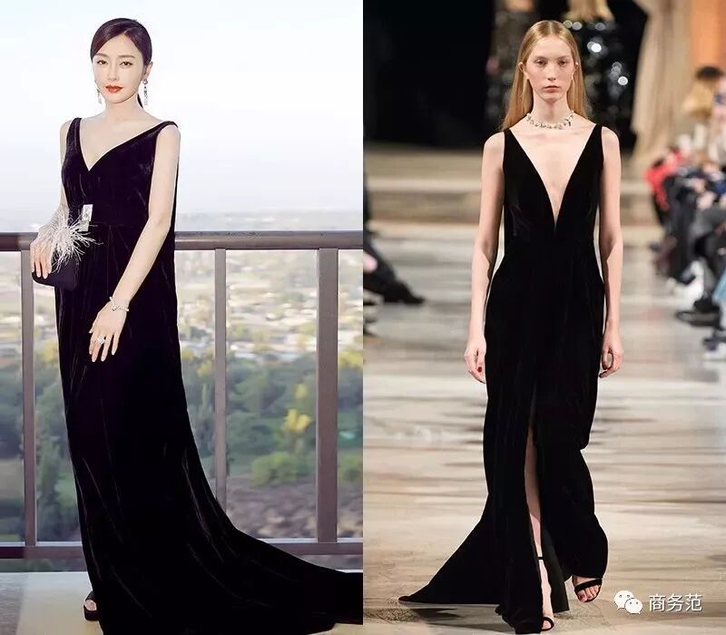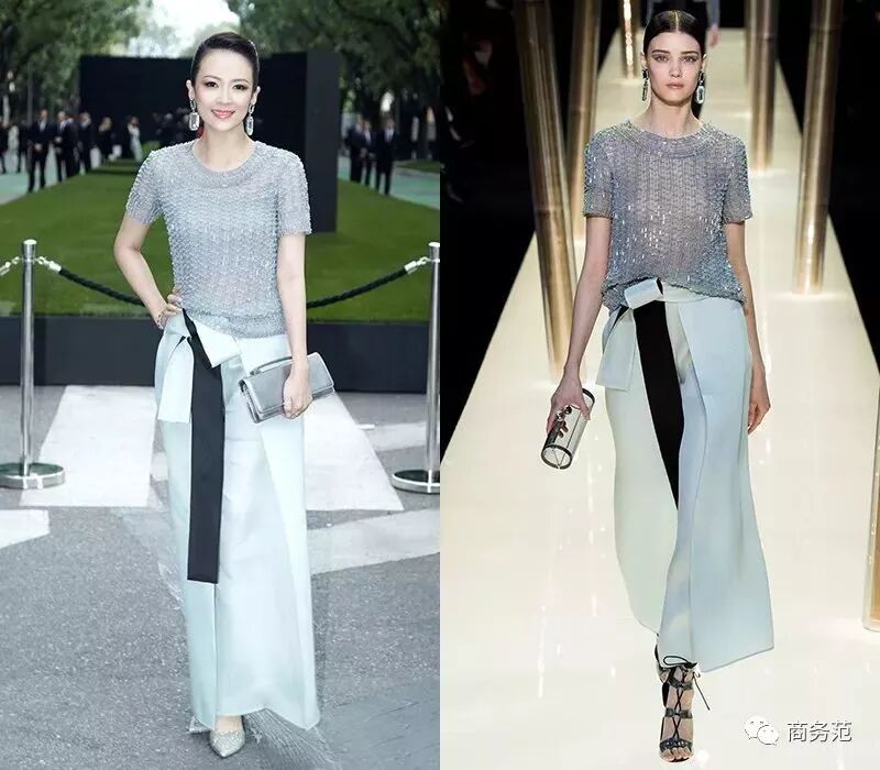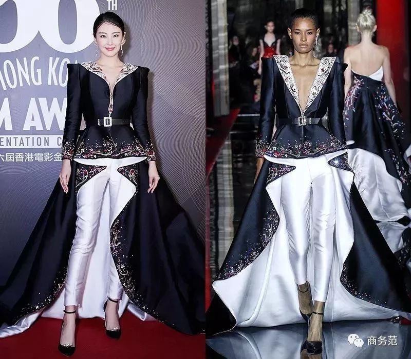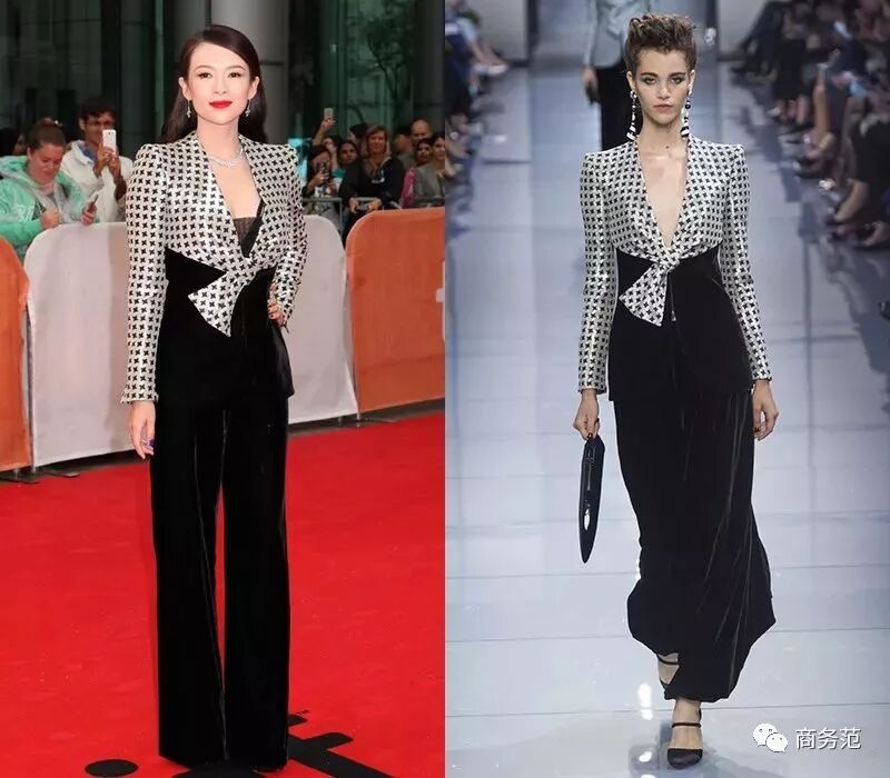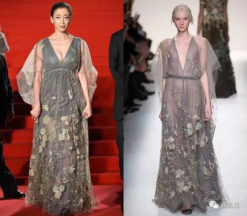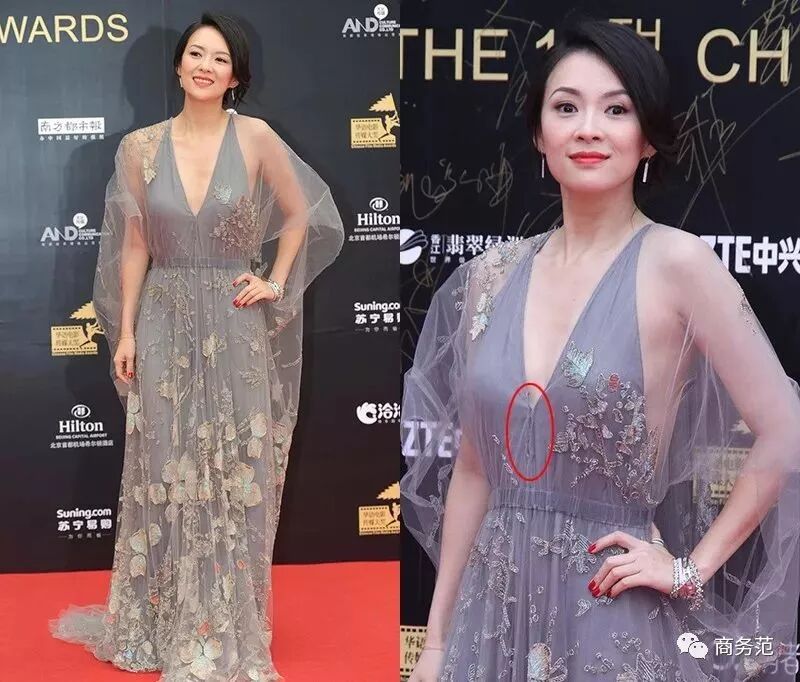 同样穿过这件衣服的还有章子怡。刚才说她是加打底的高手一点不假,这件衣服就从透视装变成了不透视的V领礼服,只不过把深V缝合起来的操作有点败笔,因为缝合痕迹太过明显,手艺还得多练练~