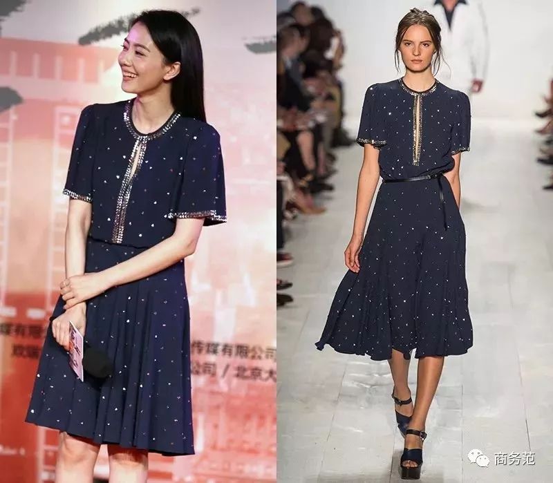 再来看看高圆圆,她选择的这件Michael Kors 2014春夏系列半袖连衣裙,本来就稍显老气,可她还偏偏把领口的开叉封掉一大半,不仅更显刻板,只留下的一小半开口,也让整体风格显得不伦不类。