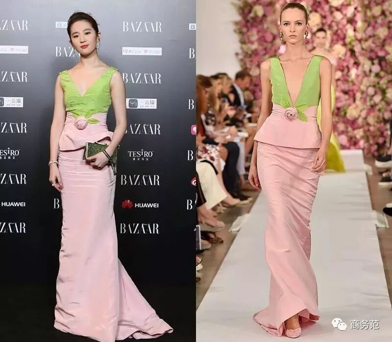 而刘亦菲身着的这件Oscar de la Renta 2015春夏系列礼服,其设计精髓完全在于深V尽头处连接的一朵玫瑰花上。不过刘亦菲的裁缝们把深V缩进了一大半,只留下一朵突兀的玫瑰花停在腰间,一下变成了鸡肋……