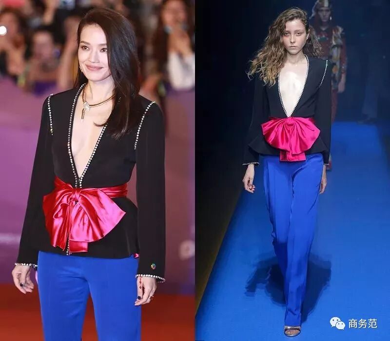 舒淇这件Gucci 2018春夏V领上衣改得就很成功。你能在腰带上一公分处隐约看到缝合的痕迹,但和秀场模特相比,只不过是领口收小了一点,整体风格不变,不仅穿它的人减少了走光的几率,还能依旧不失性感美艳。