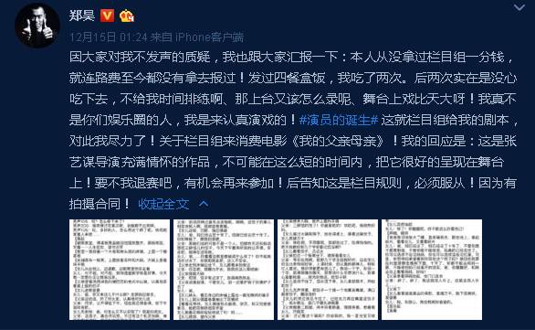 随后郑昊也发微博表示:从没拿过节目组一分钱,本想退赛却被告知这是栏目规则。