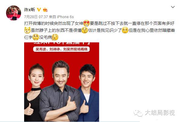 而且许昕微博关注的第一人就是刘诗诗,去年刘诗诗吴奇隆宣布婚讯的时候,许昕也是含泪转发祝福,哈哈哈真是一个心碎の粉丝