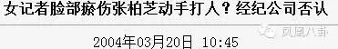 2004年,张柏芝被曝在香港九龙佐敦道动手打人。经纪公司对外宣称的经过是这样的:张柏芝开车时遭遇疑似狗仔队的跟踪,她到一栋大楼里躲了一阵,出来看到一名女孩子趴在她的车尾。张柏芝上前一看,发现她脸上有瘀伤。这时候,又来了一名手拿摄影机的人,问她:“是不是你做的?”张柏芝就因此被诬告为打人。