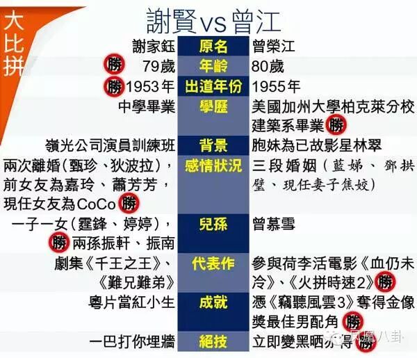 当年谢贤被视为曾江头号死敌,据说二人已积怨半世纪。以往拍戏的人都知道他们不和。