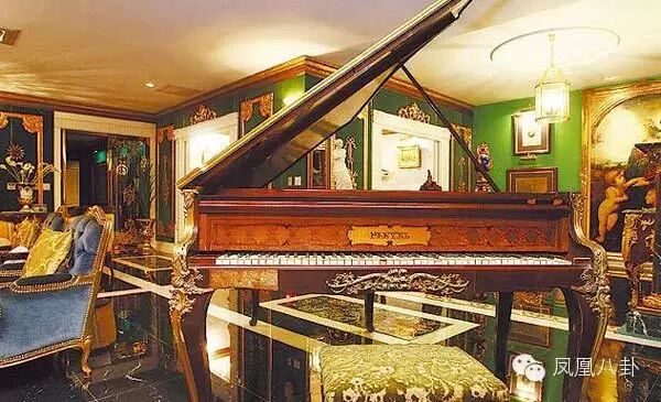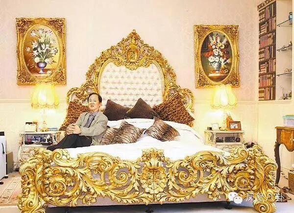主卧室里有2个更衣间,原是男女主人各一间,如今都是他的,放着200多只名表和鞋子。King Size的大床上,床架都镶金边,和他平时的霸气风格很是相衬。