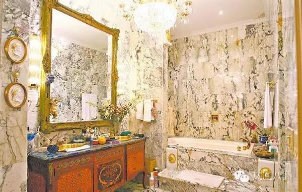 王羽连家中的洗手间也毫不马虎。豪宅内共有7间卫浴,风格各异。大理石马桶是他从纽约第五大道购入的,要价82万;洗手台则是近百万的青金石打造;浴缸只用按摩浴缸,莲蓬头全镀金。