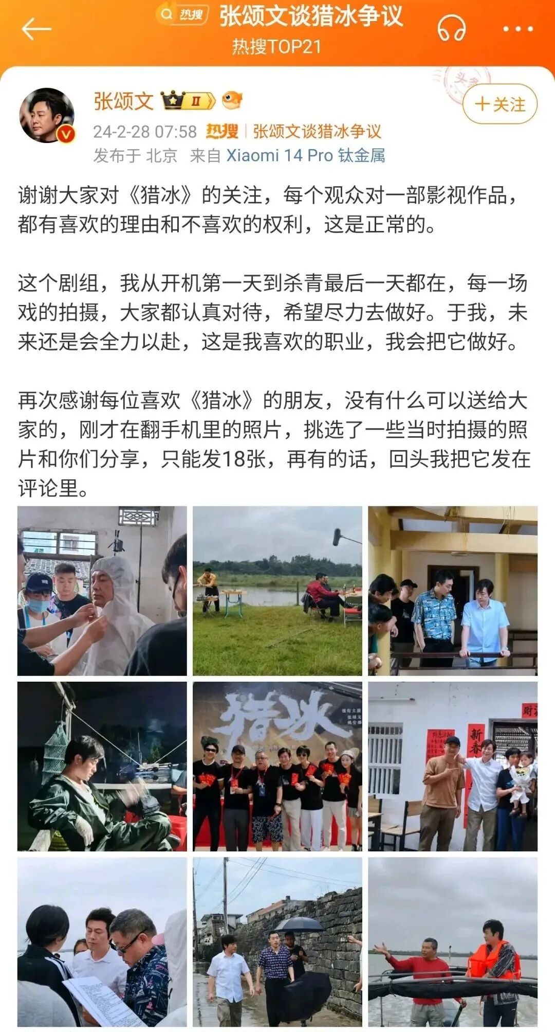 今天(2月28日)上午,张颂文发文回应近期对《猎冰》的议论。文中张颂文提到,“谢谢大家对《猎冰》的关注,每个观众对一部影视作品,都有喜欢的理由和不喜欢的权利,这是正常的。这个剧组,我从开机第一天到杀青最后一天都在,每一场戏的拍摄,大家都认真对待,希望尽力去做好。于我,未来还是会全力以赴,这是我喜欢的职业,我会把它做好。”