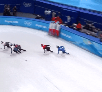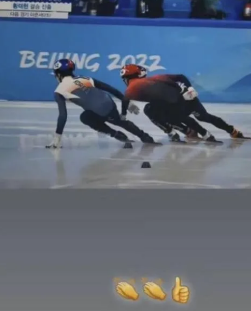 然后在2月14日和武大靖的比赛中,用后脚举起冰刀,差点划伤武大靖的脸。