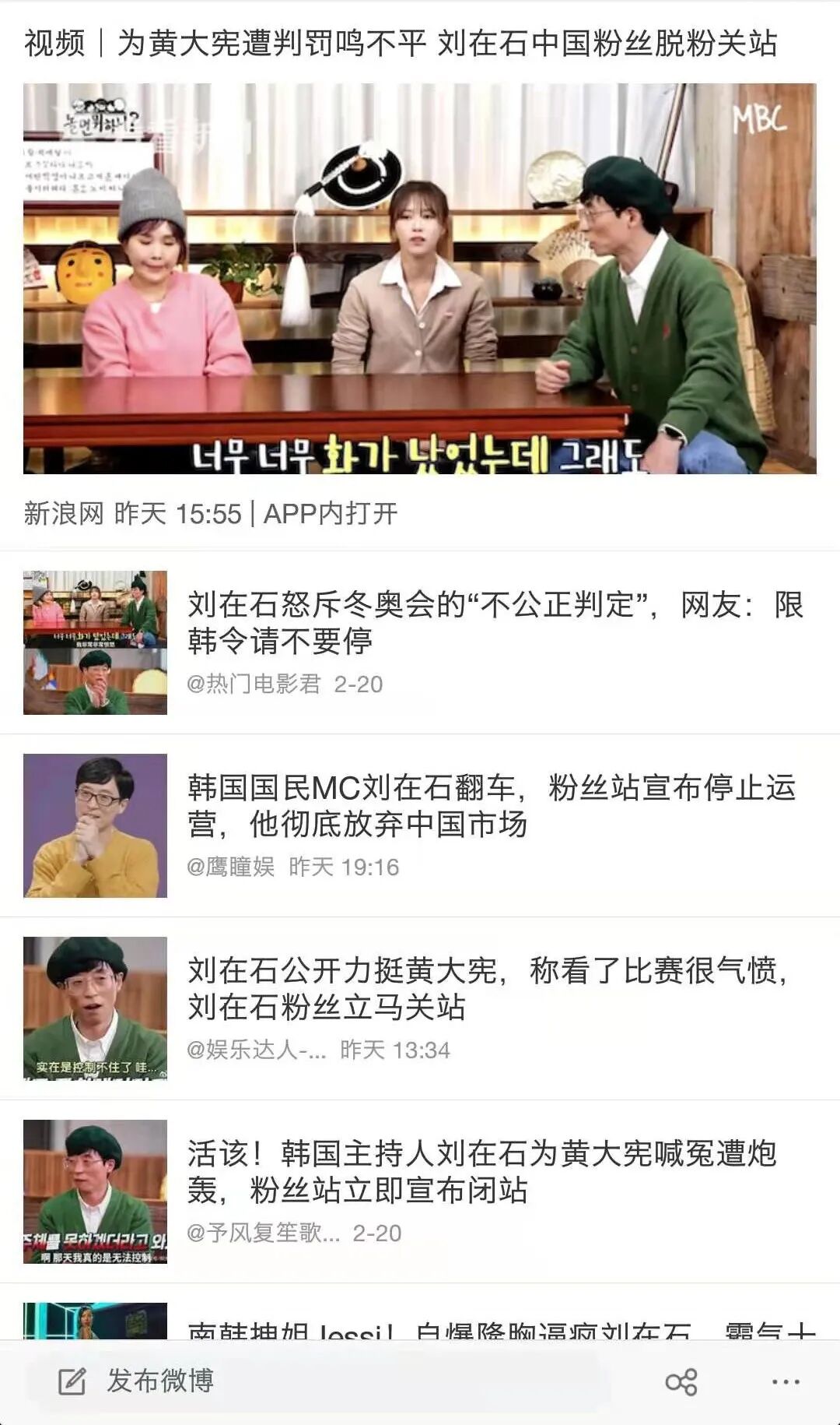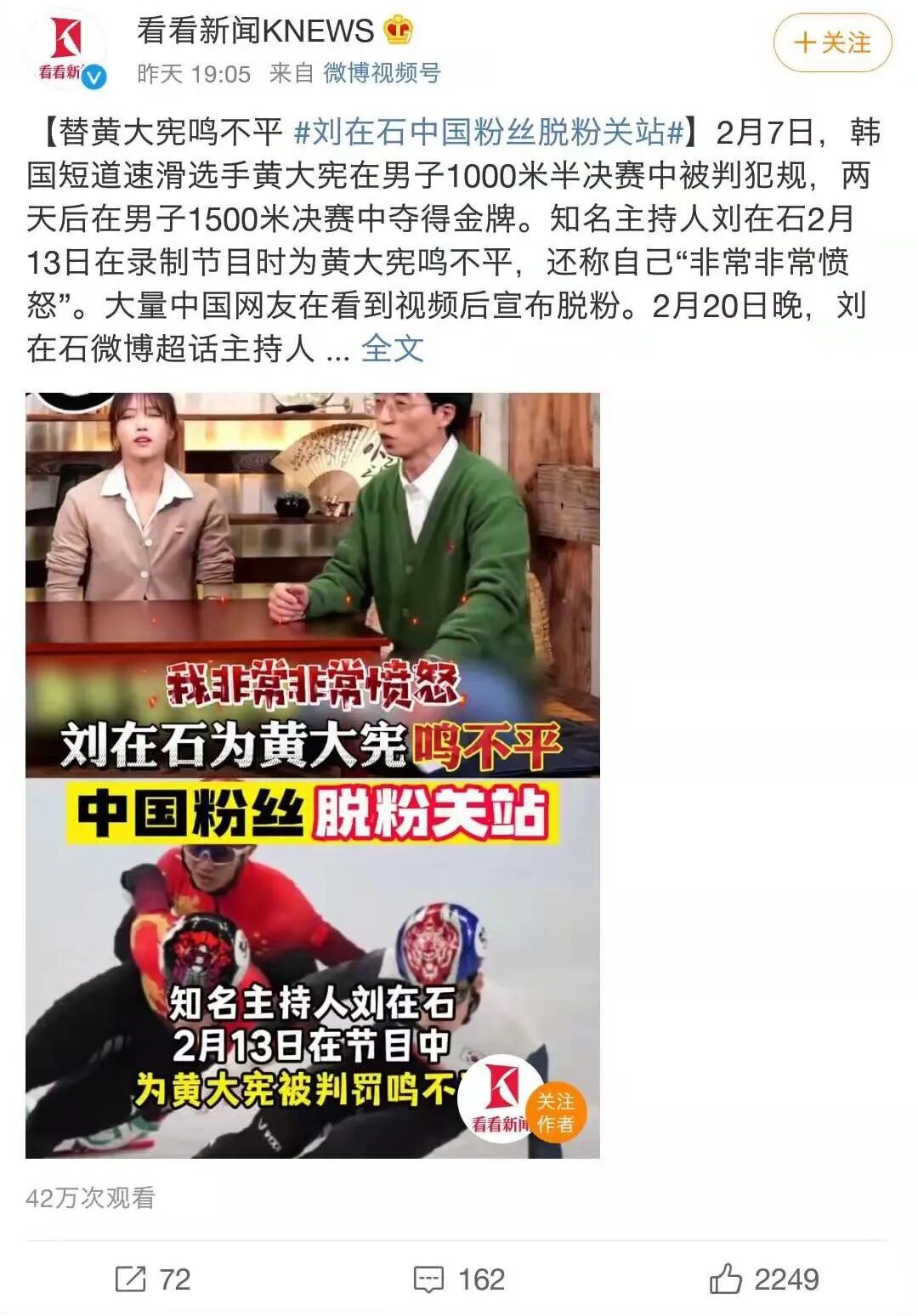 因为刘在石在一档节目中讨论冬奥话题时,无视黄大宪的违规行为。